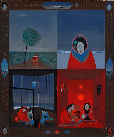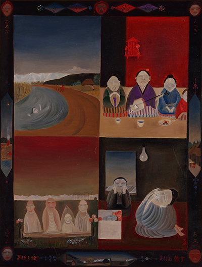 このたびの展覧会では、音楽や物語を感じさせる豊かな作品世界を展開させた岡山県ゆ かりの作家、有元利夫、直子、斎藤真一の作品を紹介しています。 画面に音楽が漂うかのような作品を描いた有元利夫。古代日本の神話的世界に基く幻想 譚を紡いだ瓜南直子。盲目の女性旅芸人・のシリーズを描いた斎藤真一。それぞれ個性あ ふれる作品を、有元・瓜南あわせて約60点、斎藤約60点展示しています。 本サイトでは下記のとおり、斎藤の《越後瞽女日記》に焦点を当てて紹介します。