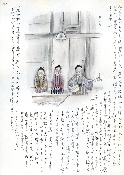 盲目の女性芸人・瞽女(ごぜ)は、農村から農村へ旅しながら三味線を弾いて唄い、生 計を立てていました。しかし戦後の環境の変化と共に、姿を消していきました。 倉敷市出身の洋画家・斎藤真一は、1964年から15年以上の間、越後(新潟県の旧国名) に通い瞽女について取材し、代表作〈瞽女シリーズ〉を制作しました。 斎藤の名を一躍有名にした〈瞽女シリーズ〉は、〈越後瞽女日記〉、〈津軽じょん から瞽女日記〉、〈お春瞽女物語り〉と、3つのテーマ順に発表されました。中でも 、素描と文章による〈越後瞽女日記〉の絵日記は400枚以上にのぼり、瞽女の貴重な記 録は勿論、彼女らの生活を支えた農村の人々との心の交流も伝えています。 このサイトでは〈越後瞽女日記〉から、絵日記を中心に絵画作品とあわせて紹介し ます。斎藤が記録し留めようとした、失われた日本の文化と心を伝える一助となれば 幸いです。